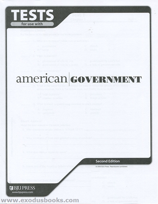 These 18 tests evaluate the student's knowledge of American government using questions designed to promote both analytical thinking and information recall. The tests reinforce the material in the student text with a variety of types of questions including multiple choice, true/false, short answer, and essay.