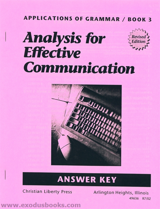 This teacher's key accompanies Applications of Grammar Book 3: Analysis of Effective Communication. Student exercises are reproduced with the correct answers overlaid and filled in. Teacher notes clarify any confusing concepts or answers. Stapled Binding.