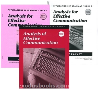 This workbook teaches students how to make the transition from practicing grammar rules to the actual process of writing. Students learn the mechanics of good writing, how to write dynamic sentences and short stories, and how to write with a colorful and appealing style. A short journalism unit is also provided. Analysis of Effective Communication teaches students' basic and advanced grammatical rules, including planning out their writing, the "building blocks" of speech, placement, building sentences, punctuation, capitalization, short story writing and more. The distinctions between words, their relation to each other in a sentence, and the rules that govern language are all featured as what creates good writing. This book contains 76 lessons. 317 non -reproducible pages, index and glossary included. NKJV used. Answers sold separately in the Applications of Grammar Book 3 - Answer Key.