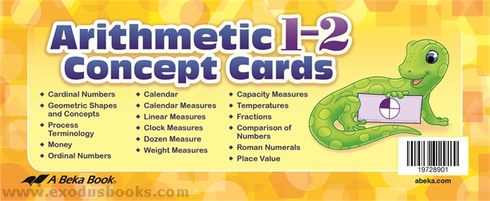 Drill and review first grade arithmetic concepts with the 193 full-color cards. These flashcard-style concept cards help you reinforce the lessons your child has learned on geometric shapes and concepts, arithmetic terms, money, ordinal numbers, calendar concepts, linear measures, telling time, weight measures, capacity measures, temperatures, fractions, Roman numerals, and place value. For systematic review of ideas and concepts, use these cards in correlation with the Arithmetic 1 work-text and the Homeschool Arithmetic 1 Curriculum Lesson Plans.