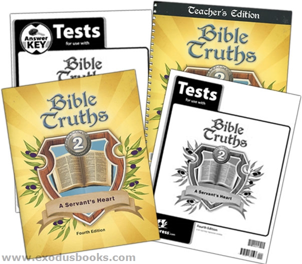 Bible Truths 2: A Servant's Heart presents a chronological study of the Old and New Testaments and encourages the student to live as well as know the Bible. Lessons feature Bible study skills, character traits, and hymn stories. Dramatic segments present heroes of the faith, while application stories show the student his need of Christ his savior and demonstrate ways to apply biblical principles to personal life situations. Lessons are included for the missionary story A Question of Yams and the application novel Pelts and Promises (novels sold separately).