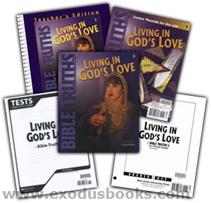 Bible Truths 5: Living in God's Love presents a chronological, thematic study of many Old and New Testament events. The student will learn eternal truths by studying biblical accounts, applying biblical principles to everyday life through stories, memorizing Scripture with understanding, singing hymns, and practicing Bible study skills. The student learns to use cross-references, a concordance, and a Bible dictionary. One unit focuses on the birth of Chist and another on His Resurrection. Songbird and Mik-Shrok are recommended as supplements (novels sold separately).