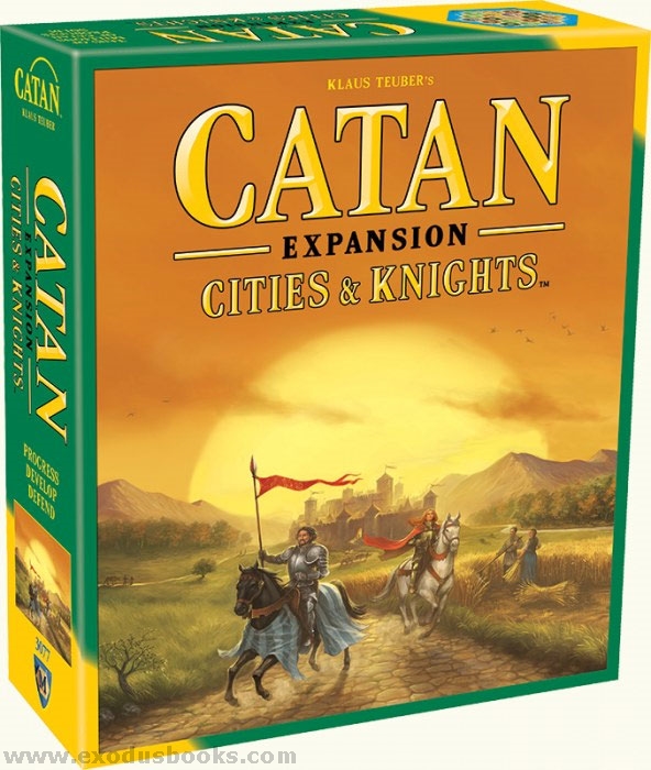 In Catan: Cities & Knights you engage in the defense of Catan and compete to build the three great metropolises of Catan. Each of these magnificent centers are even more valuable than cities and are safe from the barbarians. You must invest in city improvements, which you acquire using three commodoties of trade: Coin, Paper, and Cloth. If you improve your culter, muster your knights, and enrich your fine cities, you will be the master of the great realm of Catan!