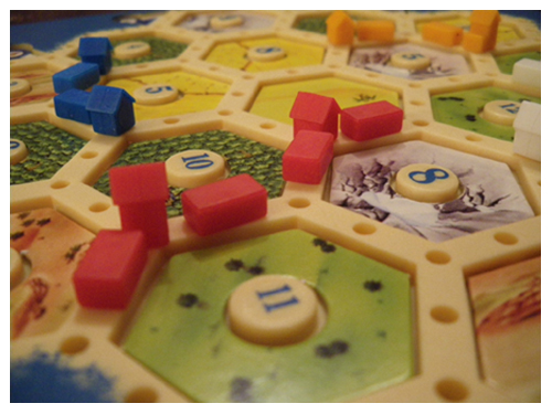 The playing pieces peg securely into place. All the cards and accessories fit into the tray in the compact game box. So, whether you're hanging out at a school or a coffee shop, cruising on the road, riding the rails, outside in windy wilds, or simply stuck in a tight place, you and your friends can now enjoy The Settlers of Catan. Set up the game freely or randomly using colorful hexagon-shaped region tiles. Align the hole in each tile over the numbers in the plastic game board and drop the regions into place. Place your starting settlements and roads into the holes along the hex sides, get your cards and you're ready to play.
