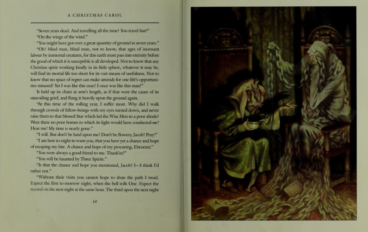 Which would be a considerable feat in itself since this is a fast-paced, thoroughly engrossing tale with enough humor, excitement and tender moments to keep anyone intrigued long enough to finish the story. The plot is well-known: Scrooge is a bitter old man, selfish and alone, who sees no value in the celebration of Christmas, largely because it centers around a profound sense of joy for which he has no utilitarian purpose. To help him see the error of his own ways, Scrooge is visited first by his old colleague Bob Marley—now a ghost—who informs him three spirits will be arriving to take him on a tour of his own life. The spirits are punctual, and before the end of the night old Ebenezer has revisited key Christmases in the past as well as a very dark one yet-to-come, exposing a life of pain inflicted and pain endured. His consequent jubilant surrender to good-will and "Christmas cheer" is one of the high points in literature.