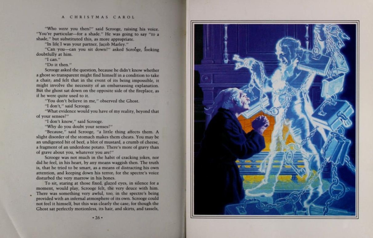 Which would be a considerable feat in itself since this is a fast-paced, thoroughly engrossing tale with enough humor, excitement and tender moments to keep anyone intrigued long enough to finish the story. The plot is well-known: Scrooge is a bitter old man, selfish and alone, who sees no value in the celebration of Christmas, largely because it centers around a profound sense of joy for which he has no utilitarian purpose. To help him see the error of his own ways, Scrooge is visited first by his old colleague Bob Marley—now a ghost—who informs him three spirits will be arriving to take him on a tour of his own life. The spirits are punctual, and before the end of the night old Ebenezer has revisited key Christmases in the past as well as a very dark one yet-to-come, exposing a life of pain inflicted and pain endured. His consequent jubilant surrender to good-will and "Christmas cheer" is one of the high points in literature.