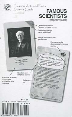 The Classical Conversations science cards were revised in 2018. Whereas the first editions each had 31 cards (numbered consecutively from 1-124 throughout the series), the 2nd edition sets include 36 cards, each labeled for the appropriate cycle (Seeking to Know: Famous Scientists is used over the course of all three cycles). These offer "pegs" on which kids can "hang" more information as they research and learn. Made from sturdy glossy cardstock, every card features a full-color image and title denoting the topic on one side, and in-depth explanation on the other side. These sets are reused every three years, so kids are encouraged to memorize titles first, and familiarize themselves with the explanations later.