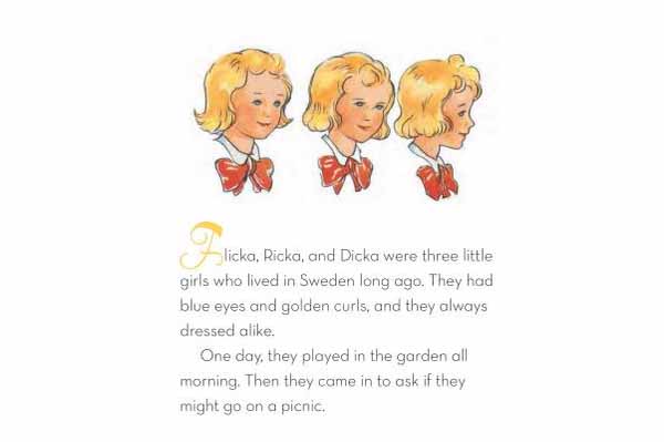 Flicka, Ricka, and Dicka were three little girls who lived in Sweden. They had blue eyes and yellow curls, and they looked very much alike.