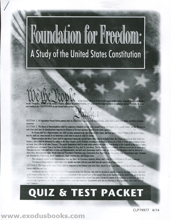 This packet contains twelve quizzes and thirteen tests which are used to evaluate a student’s understanding of the Foundation for Freedom subject matter. The quizzes use fill-in-the-blank responses to check a student's comprehension of the material being studied, while the tests incorporate multiple choice, true and false, and matching questions to confirm retention. The final test requires knowledge of the original Constitution and all of the amendments.