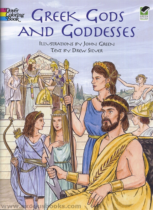 Ready-to-color illustrations, each accompanied by a page of descriptive text, depict Atlas holding up the heavens; Hermes slaying the many-eyed Argus; Aphrodite weeping over the body of Adonis; and 19 other exciting illustrations.