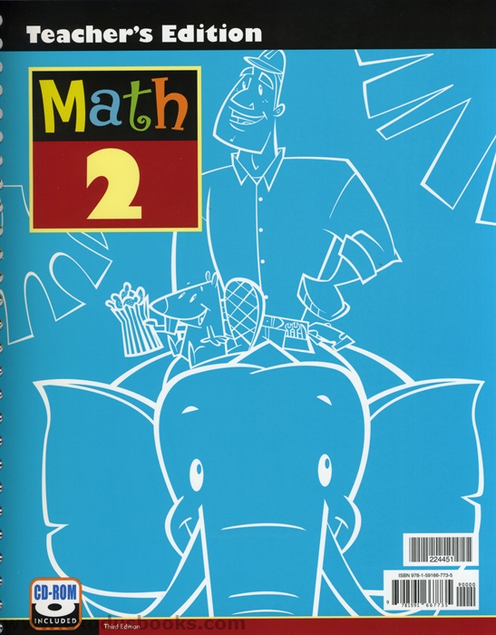The Teacher's Toolkit CD, which accompanies this TE, includes the reproducible pages from the Appendix of the Teacher Edition, Fact Reviews, Re-Teaching pages, and Enrichment pages which provide worksheets to challenge the advanced student. The Teacher's Visual Packet is also included for use by home educators and those teaching small groups. Colored transparencies may be made for use in the classroom. The answer key for the Math 2 Reviews is located only on this CD.