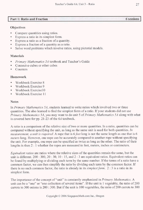 This guide for the Primary Math 6A textbook and workbook is designed to help teachers understand the course material, see how each section fits in with the curriculum as a whole, and prepare the day's lesson. The course material is divided into 70 sessions. These sessions can be extended by including additional problems from supplementary material, or bringing in review from earlier levels of Primary Mathematics.