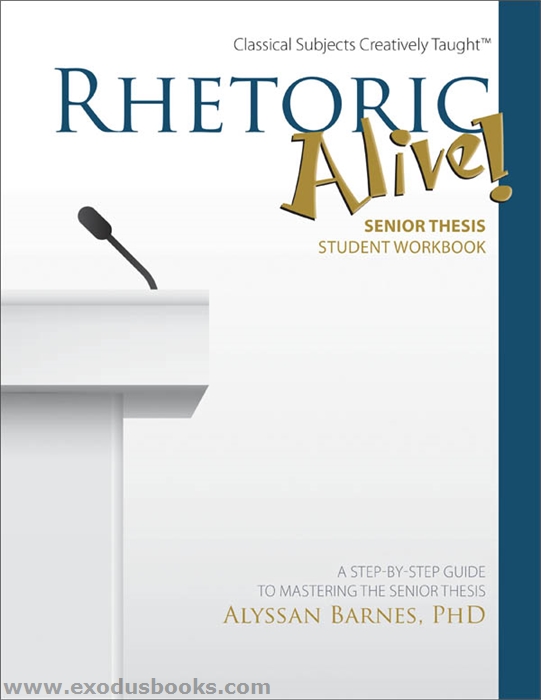 Through the use of workshops, assignments, and presentation practices, the Rhetoric Alive! Senior Thesis workbook walks students step-by-step through the process of writing and then delivering a thesis. Students will gradually draft the six parts of the thesis—introduction (exordium), statement of facts (narratio), thesis statement (partitio), argument (confirmatio), counterargument (refutatio), and conclusion (peroratio)—as they are taken through the thesis process from start to finish, from choosing a topic to crafting a snappy title, and everything in between.