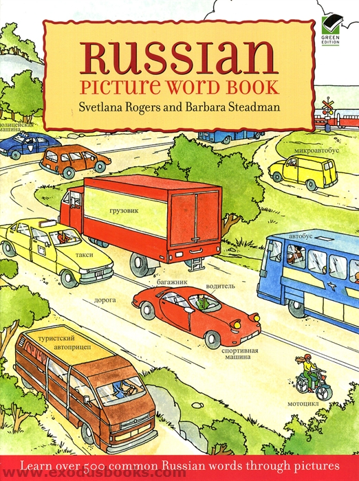 Presents fifteen illustrated scenes that portray common types of people, animals, places, and things along with the corresponding words for them in Russian, as well as a list of the Russian words and their English translations.