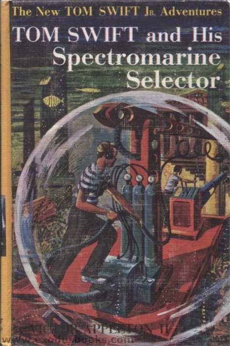 Here, with his pal Bud Barclay and other members of the Swift expedition, Tom tests his two new inventions. With the de-organic-izer, which employs revolutionary scientific principles, crusts of centuries-old sea growth are removed from the city's buildings and the original gold luster restored. With his other astounding invention—the spectromarine selector—Tom searches for a valuable new rare metal. He must succeed, if his father is to fill an important government rocket contract.