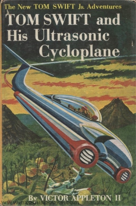 "There's part of Bud's wrecked plane!" Hovering his new cycloplane, the DRUMHAWK, in turbulent skies above the wilds of the New Guinea jungle, Tom Swift Jr. points to the sheared-off wing of his friend's plane. The area, flanked by two extinct volcanoes, is as forbidding as the deserted native huts clustered in sinister shadows.