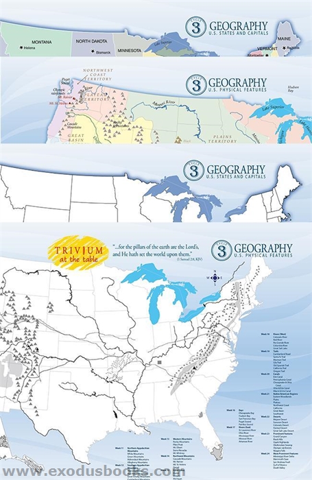 With these colorful placemats, your little ones can learn geography while they snack and play. On one side of each mat is a “key” showing the Cycle 3 geography memory work properly placed on the map. The other side lists the facts by week and shows small icons and images to help children point to the correct location of each fact. Placemats are laminated, with rounded edges, for the wear and tear of daily use. Wipes clean at the end of the day! This set of 2 placemats corresponds to the Foundations 4th edition, Cycle 3.