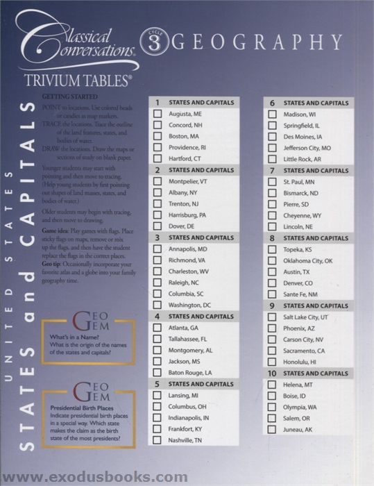 This convenient resource provides everything students need to preview and review geography! Each laminated table lists the geography terms for the current Foundations cycle, map keys, and a large black line master for students to trace, color, or copy as they learn. Tables fold to fit conveniently in a notebook or tote, so they go where you go! Geography Cycle Three includes U.S. states, capitals, and physical features maps.