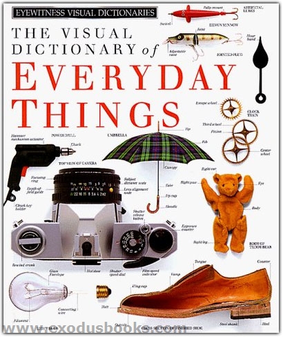 Text, "exploded view" photographs, and labels reveal everyday objects and their parts, including the telephone, camera, and bicycle.