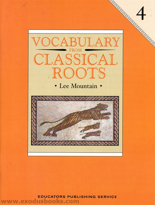 Vocabulary from Classical Roots Book 4 is a thematically organized vocabulary program based on Greek and Latin roots. Each lesson features 2 roots and 8 words derived from these roots. Words are presented with dictionary-style definitions, and all words are used in example sentences.