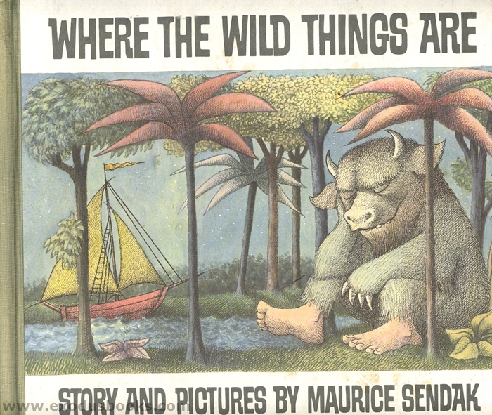 Sendak's classic illustrations are big and fanciful, with heavy crosshatching giving it a textured look. The monsters are somewhat frightening, and are the reason this book was initially banned by a number of libraries. Sendak modeled his wild things after grotesque drawings he used to make of his relatives. The dark color pallete and the pictures that get bigger and then smaller contribute to the dark feelings in Max's mind and imagination.